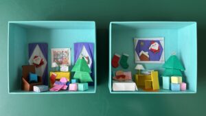 2年くらい前に、手のひらサイズの箱の中に作ったクリスマス風景が、個人的にとても気に入ったので、知人のお嬢さんと、お世話になっている女医さんに送った。そうしたら少しさびしくなったので、今年、また自分用に新たに作り直した(右が新作)!